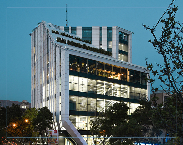 بخش تجاری پروژه در طبقات همکف تا هفتم توسعه یافته و فضاهای اداری در دو طبقه مجزا طراحی شدهاند. در طراحی پلکانی بخش فوقانی، با ایجاد تراسهای سبز، زیبایی بصری بنا افزایش یافته و بخشی از سیستمهای تاسیساتی بهشکل هوشمندانه پوشش داده شده است.